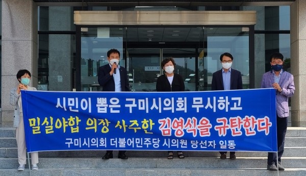 이번 구미시의회 더불어 민주당의원의 기자회견은 오는 7월1일 제9대 구미시의회 의장 선출에 대하여 관례적으로 갑과 을로 지역구가 서로 나눠서 시의회 의장을 맡는 관례에 따라서 국힘 시의원을 시의회 의장으로 선출하기로 합의했다.