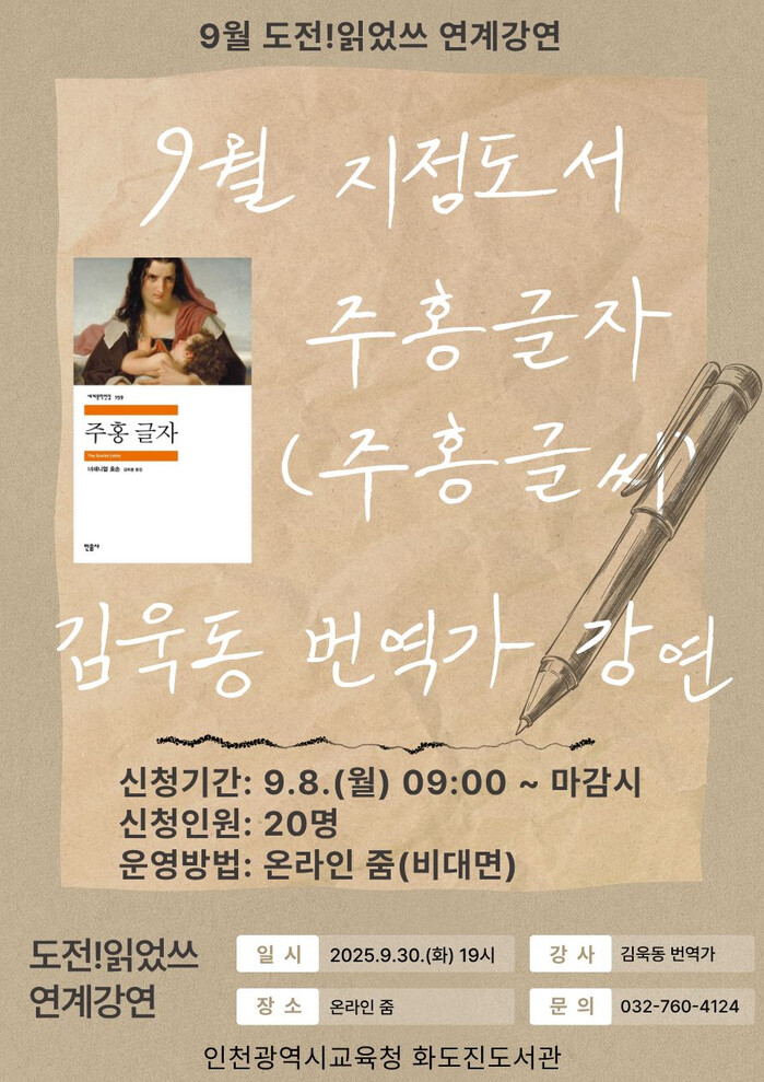 [인천=문찬식 기자] 인천광역시교육청화도진도서관(관장 박은정)은 9월 ‘독서의 달’을 맞아 오는 9월 30일(화) 오후 7시부터 9시까지 ‘도전! 읽었쓰’ 연계 강연 ‘주홍글자(주홍글씨)의 이해’를 비대면으로 운영한다.