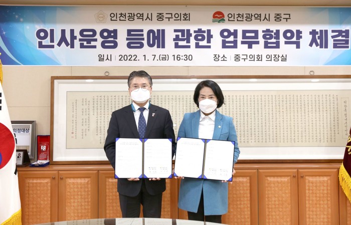 [인천=문찬식 기자] 인천 중구의회와 중구청이 최근 구의회 의장실에서 인사운영 등에 관한 업무협약을 체결했다.