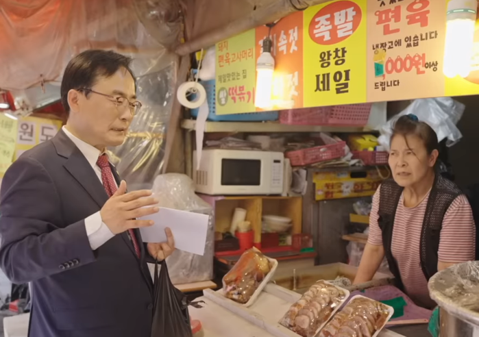 | ▲ ‘혼쭐나러갑니다’ 촬영 당시 도곡시장 상인에게 의견 청취 후 답변하는 김형재 의원(왼쪽). (사진=서울시의회 제공) |