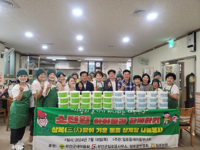 [무안=황승순 기자]무안군 일로읍 새마을부녀회(회장 김영숙)는 18일 종합사회복지관에서 어르신들께 삼계탕을 대접하는‘삼복 맞이 행복한 나눔’ 행사를 펼쳤다.