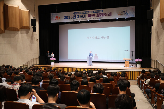 | ▲ 장인홍 구로구청장이 7월10일 구로구민회관 대강당에서 열린 2025년 3분기 직원 정례조례에서 취임 100일을 맞아 기본사회를 주제로 조례사를 하고 있다. (사진=구로구청 제공) |
