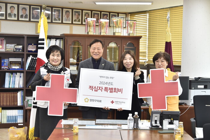 [시민일보 = 이대우 기자] 서울 양천구의회가 최근 의장실에서 대한적십자사 서울지사에 ‘2024년도 적십자 특별회비’를 전달했다.