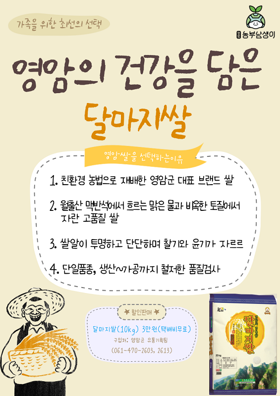 이밖에 달마지쌀 판매와 쌀케팅에 대한 자세한 안내는 영암군 유통기획팀으로 전화 하면 된다.