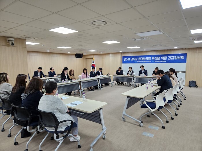 | ▲ 당수초등학교 급식실 현대화 사업 추진을 위한 긴급 정담회 진행 모습. (사진=경기도의회 제공) |