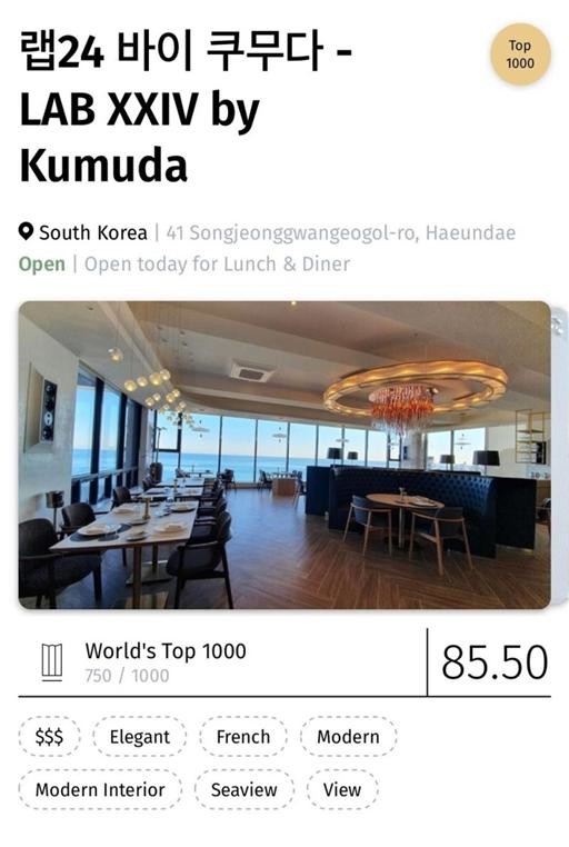 1,000대 레스토랑 중 한국 36개 선정, 서울을 제외한 레스토랑은 부산 소재 LAB24 유일