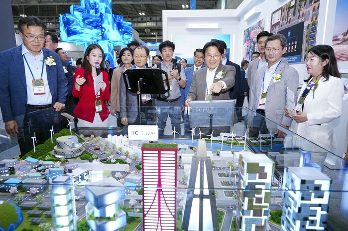 | ▲ 강기정 광주광역시장이 지난달 28일 오후 서구 김대중컨벤션센터에서 열린 ‘2024 대한민국 기후환경에너지대전(KEET 2024)’ 개막식에 참석해 한전 전시장에서 에너지 신시대 직류(DC)의 미래 ’DC Town‘ 모형을 살펴보고 있다./광주광역시 제공 |