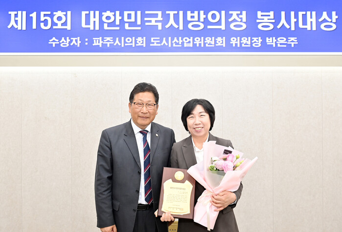 [파주=조영환 기자] 경기 파주시의회 박은주 의원이 최근 시·군자치구의회 의장협의회에서 주관하는 ‘제15회 지방의정봉사대상’ 수상의 영예를 안았다.