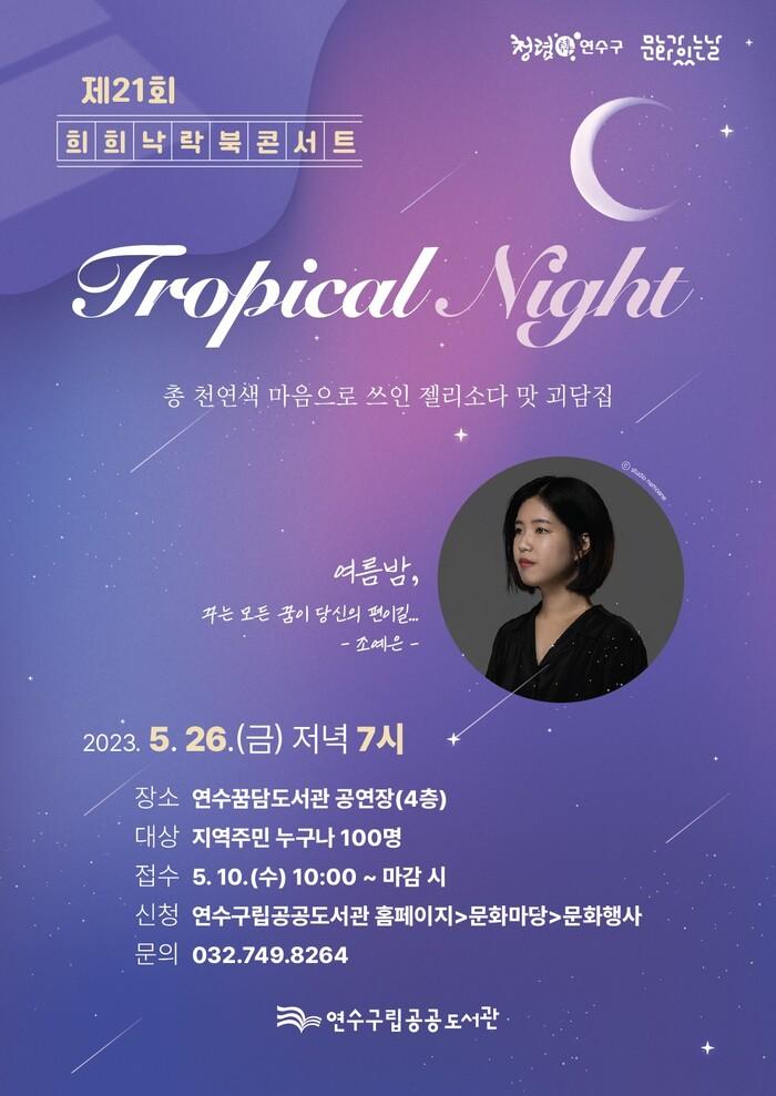 [인천=문찬식 기자] 인천 연수구 연수청학도서관(관장 김진섭)은 오는 26일 연수꿈담도서관 공연장에서 지역주민을 대상으로 ‘제21회 희희낙락 북콘서트’를 개최한다.