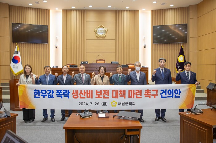 “한우값 폭락 생산비 보전 대책 마련 및 ‘한우산업 기본법’ 제정 촉구 건의안”은 해남군의회 총무위원회 위원장인 민경매 의원이 대표 발의했고, 군의회 의원 10명 전원이 공동발의에 참여해 본회의에서 가결했다.