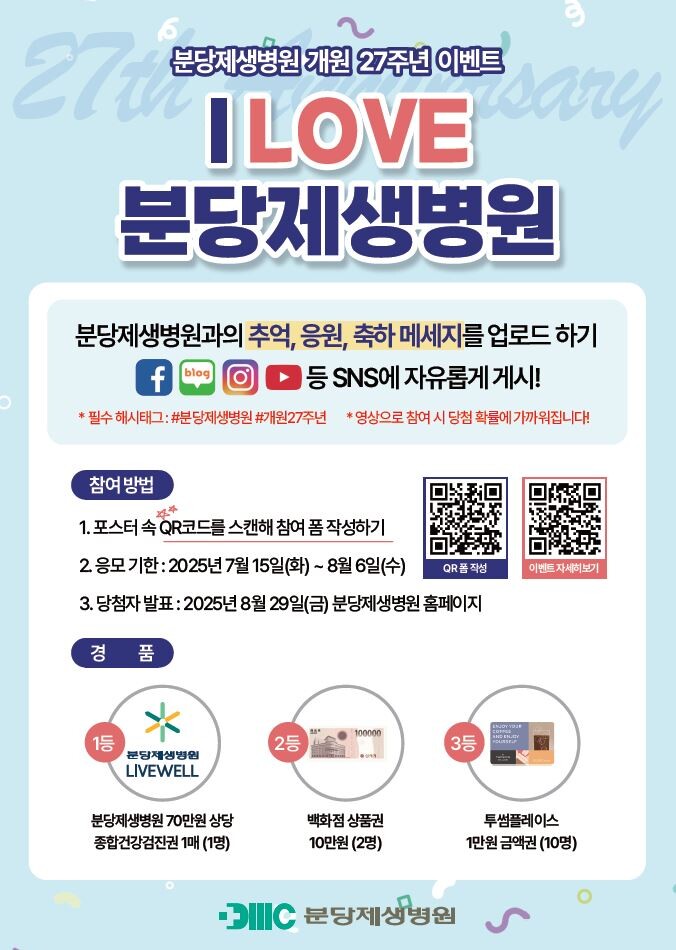 한편, 분당제생병원 개원27주년 기념 ‘I LOVE 분당제생병원’ 이벤트는 7월15일부터 8월6일까지 진행되고, 당첨자 발표는 개원기념일인 8월29일에 홈페이지를 통해 이뤄질 예정이다.