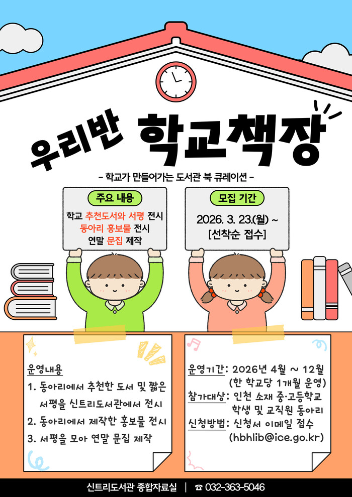 [인천=문찬식 기자] 인천광역시교육청신트리도서관(관장 정경애)은 인천 관내 중·고등학교를 대상으로 ‘우리반 학교책장’ 의 참가 동아리를 3월 23일부터 모집한다.