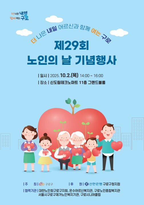[시민일보 = 박소진 기자] 구로구(구청장 장인홍)가 오는 10월2일 오후 1시에 신도림테크노마트 11층 그랜드볼룸에서 제29회 노인의 날 기념행사를 개최한다.