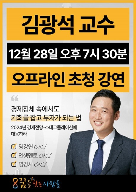 오프라인 강연 플랫폼 ‘꿈을 찾는 사람들’(이하 꿈찾사)이 오는 28일 오후 7시 30분 ‘경제 읽어주는 남자’ 김광석 교수 특별 무료 강연을 펼친다고 21일 밝혔다.