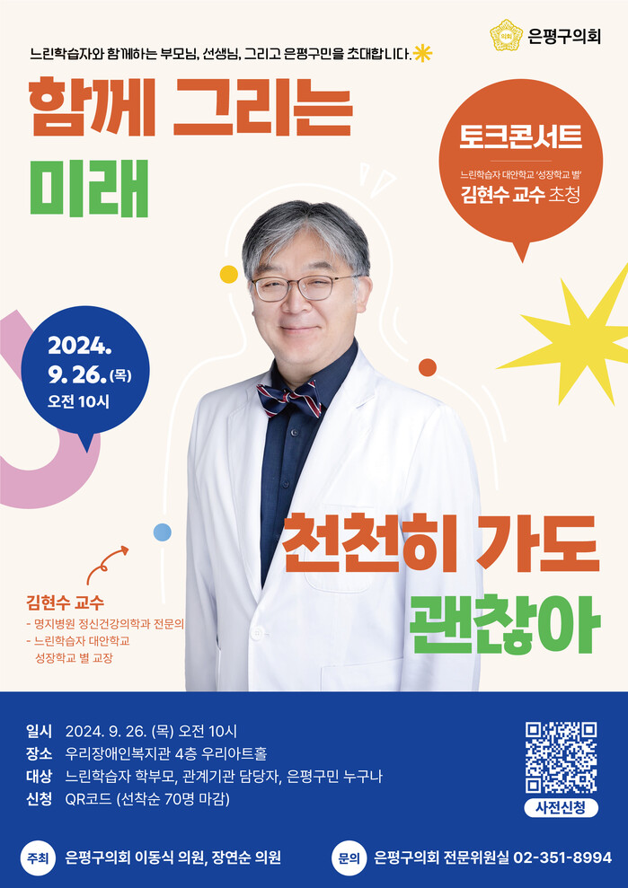 첫 번째 토론회는 오는 26일 오전 10시 ‘함께 그리는 미래, 천천히 가도 괜찮아’라는 주제로 김현수 정신과 전문의(명지병원 정신건강의학과 전문의, 느린 학습자 대안학교 성장학교 별 교장)의 특강과 느린학습자와 함께 걷는 사람들의 사연을 중심으로 토크콘서트가 진행 될 예정이다.