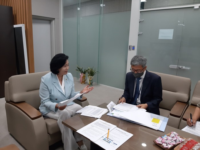 | ▲ 정윤경 의원이 도 교육청 민주시민교육과 관계자와 함께 '(가칭)경기 평화·통일교육센터' 추진 현황에 대해 의견을 나누고 있다. (사진제공=경기도의회) |