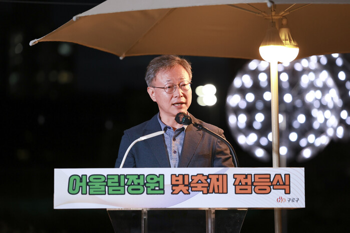 | ▲ 어울림정원 빛축제 점등식에서 인사말을 전하고 있는 장인홍 구로구청장의 모습. 야외에 설치된 조명 아래에서 빛축제의 시작을 알리고 있다. (사진=구로구청 제공) |