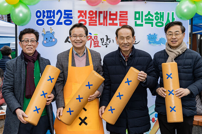 25일 영등포구 양평2동에서 2024년 정월대보름 민속행사가 열렸다. 사진은 민속행사에 참석한 최호권 구청장(왼쪽 두 번째) 및 참여자들이 윷을 들고 기념촬영을 하고 있는 모습. (사진=영등포구청 제공)