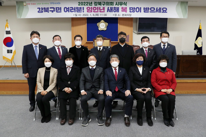 이 의장은 시무식 신년 인사에서 "끝을 알 수 없는 코로나19 위기 속에서 지난 2년 동안 우리는 어렵고 힘든 시간을 보내왔다. 특히 팬데믹 상황 속에 출범한 제8대 후반기 의회는 시작부터 코로나19 극복을 목표로 달려왔기에 아직도 방역의 연장선 위에 있다는 사실이 안타깝다. 그러나 이처럼 힘든 상황 속에서도 변화와 희망을 이끌어갈 수 있었던 힘은 오직 구민 여러분의 희생과 응원 덕분이었다"며 "2022년 새해, 국가와 지역의 미래를 결정짓는 제20대 대통령선거와 제8회 전국동시지방선거가 잇따라 치러지고 개정된 지방자치법이 전면 시행되는 역사적 전환기를 맞아, 이 모든 법과 제도의 개선이 구민의 행복과 강북구 발전으로 이어질 수 있도록 강북구의회가 마지막 순간까지 최선을 다하겠다"고 힘찬 새해 포부를 밝혔다.