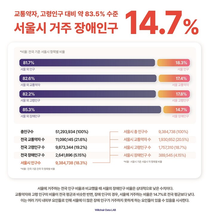 윌체어의 연구부서 '윌체어 데이터 랩'의 진단에 따르면, 서울특별시 인구 구성에서 주목할 점은 서울에 거주하는 장애 인구 비율이 전국 평균에 비해 낮다는 것이다. 전국 장애 인구 비율은 5.15%인 반면, 서울시의 경우 전체 인구 중 장애 인구 비율은 4.15%이다. 이는 서울에 거주하는 사람들의 비율과 비교했을 때 상대적으로 낮은 수치이다. 서울에는 전국 인구의 약 18%가 거주하고 있으며, 전국 고령 인구의 17.8%가 서울에 거주하고 있다. 해당 수치는 서울에 거주하는 교통약자와 고령 인구의 비율이 전국 평균과 비슷하며, 장애 인구의 경우 서울에 거주하는 비율은 14.7%로 전국 평균보다 낮다는 것을 보여준다.