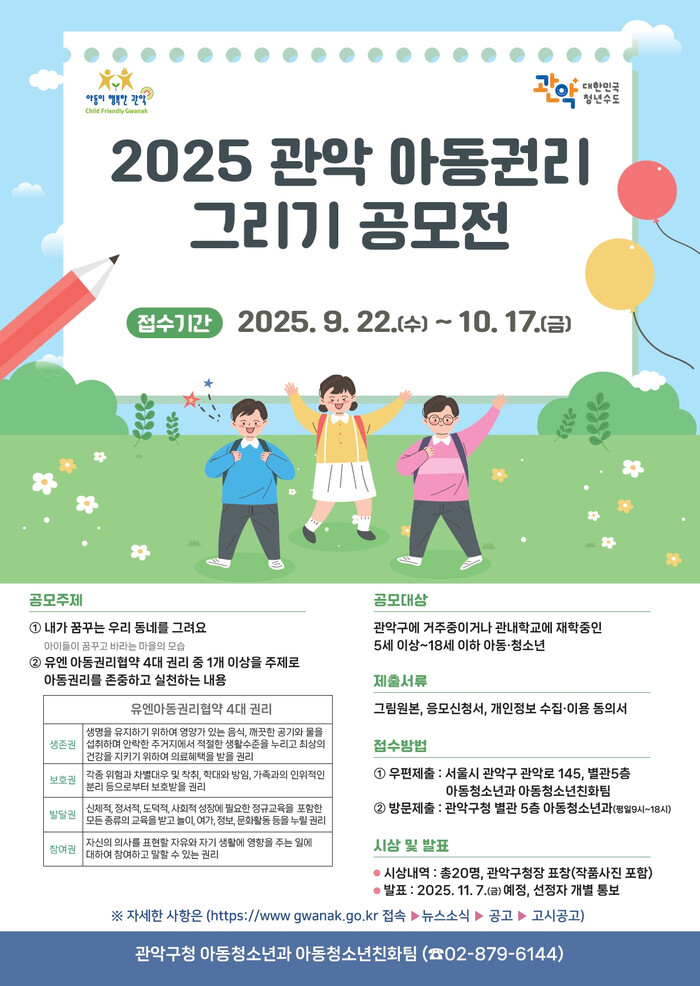 응모 기간은 오는 10월 17일까지이며, 참가 대상은 관악구 내 어린이집, 유치원, 초중고교에 재학 중이거나 관내에 거주 중인 5세~18세 이하의 아동과 청소년이다.
