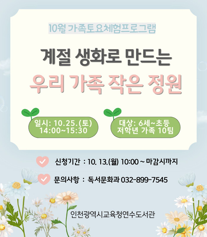 [인천=문찬식 기자] 인천광역시교육청연수도서관(관장 서경희)은 오는 10월 25일(토) 오후 2시 평생학습1실에서 가족 이용자를 위한 ‘10월 가족 토요체험 프로그램’을 운영한다.