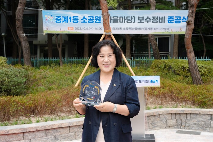 [시민일보 = 이대우 기자] 봉양순 서울시 환경수자원위원회 위원장(노원3)이 최근 중계1동 소공원에서 열린 노후 마을마당 보수정비 준공 행사에서 노원구청으로부터 ‘감사패’를 수여 받았다.