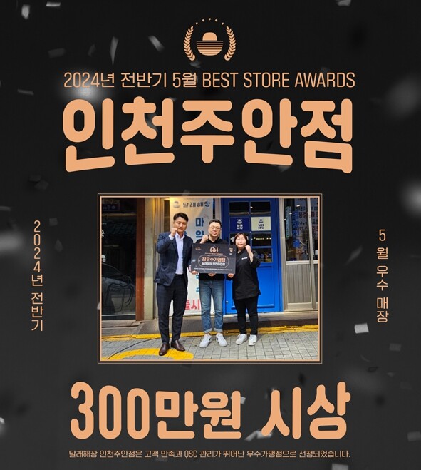 브랜드 관계자는 "지난 1월 천안 신불당점, 2월 강서구청점, 3월 논현영동시장점, 4월 방이점에 이어 인천주안점이 5월 우수 가맹점으로 선정됐다"며 "인천주안점은 본사 기준에 부합하는 QSC 관리를 실행한것은 물론이고 고객만족도 또한 높게 나타나 우수 가맹점 시상과 함께 소정의 현금을 전달했다"고 말했다.
