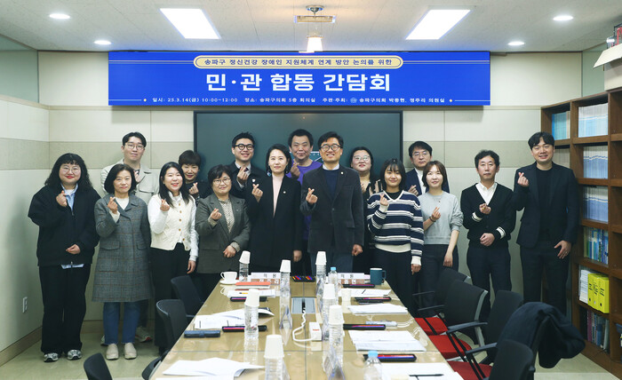 [시민일보 = 이대우 기자] 서울 송파구의회 정주리·박종현 의원이 주최한 ‘정신건강 장애인 지원체계 연계방안 논의를 위한 민·관 합동 간담회’가 최근 송파구의회 5층 회의실에서 열렸다.