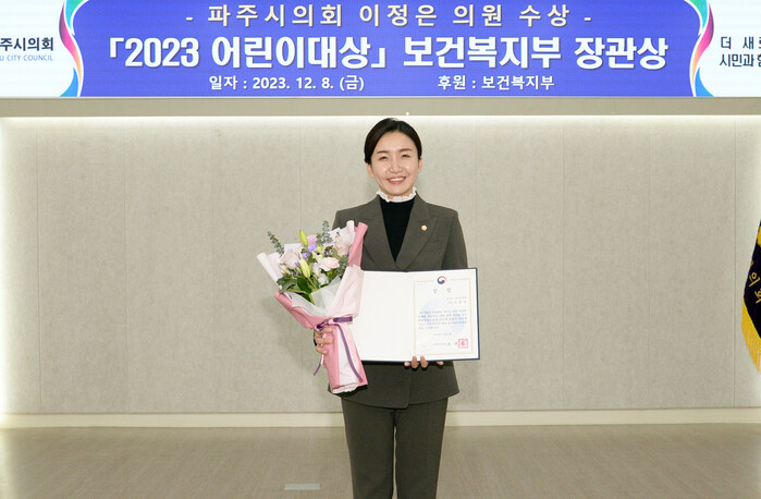 [파주=조영환 기자] 경기 파주시의회 이정은 의원이 최근 열린 '2023 어린이대상' 시상식에서 보건복지부장관상을 수상했다.