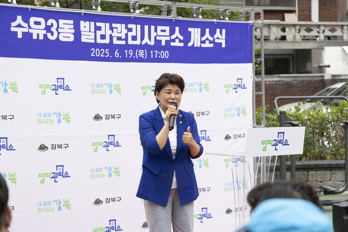 [시민일보 = 문민호 기자] 서울 강북구의회 김명희 의장은 최근 개소한 송천동, 수유3동 등 3곳의 빌라관리사무소 확대구역 개소식에 참석해 주민들과 함께 축하하고, 해당 사업의 의미와 앞으로의 기대를 전했다.
