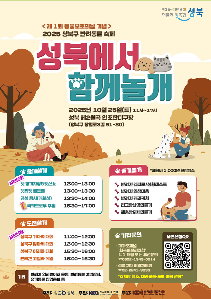 [시민일보 = 문민호 기자] 성북구(구청장 이승로)가 2025년 성북구 반려동물 축제 ‘성북에서 함께놀개’를 오는 10월 25일 토요일 성북 제2월곡잔디구장에서 개최한다.
