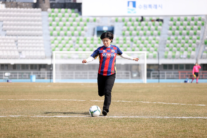 [수원=임종인 기자] 경기 수원시의회 문화체육위원회 장미영 위원장이 최근 수원종합운동장에서 열린 2025시즌 WK리그 수원FC위민 홈 개막전에 참석해 시축을 하며 시즌 개막을 축하했다.
