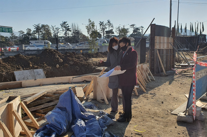 | ▲ 조성현장을 방문한 신무연 의원(오른쪽)이 관계자와 의논을 하고 있다. (사진제공 = 강동구의회) |