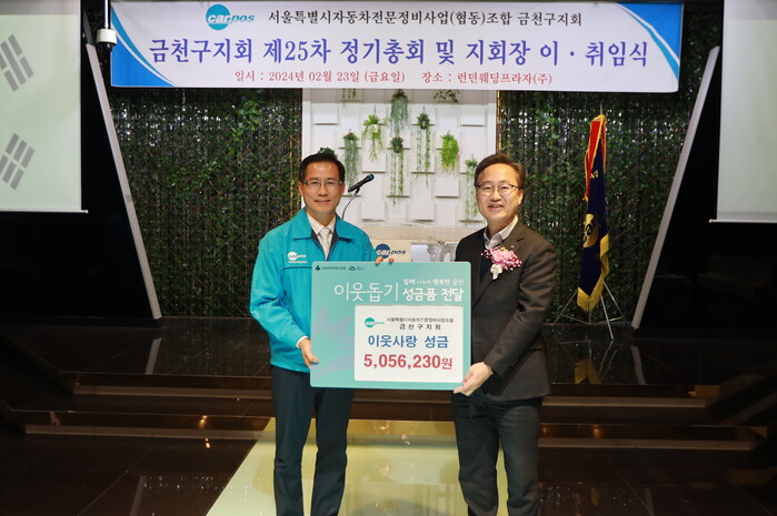 최근 서울시자동차전문정비사업조합 금천구지회가 경제적 어려움을 겪는 지역내 취약계층을 위해 성금 505만원을 금천구청에 기탁했다. 성금 전달식은 금천구지회 제25차 정기총회에서 유성훈 구청장과 정춘식 금천구지회장, 조합 관계자 등 130여명이 참석한 가운데 진행됐다. 사진은 유 구청장(오른쪽)이 기념촬영을 하고 있는 모습. (사진=금천구청 제공)