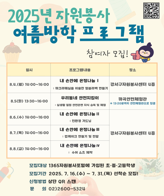 [시민일보 = 박소진 기자] 강서구(구청장 진교훈)는 여름방학을 맞아 지역 청소년들을 위한 ‘2025년 자원봉사 여름방학 프로그램’ 참가자를 모집한다고 밝혔다.