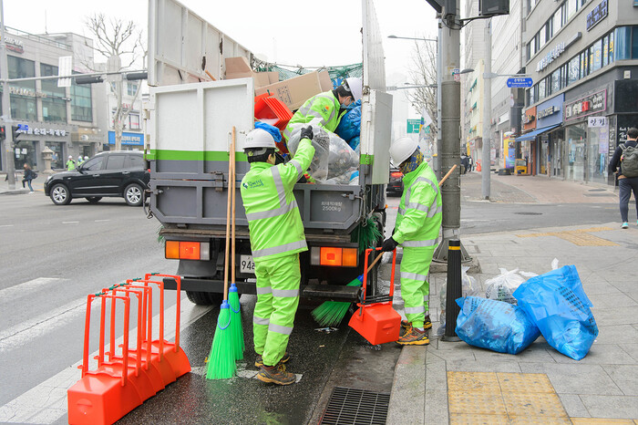 | ▲ 도로변을 청소중인 환경미화원. (사진=양천구청 제공) |