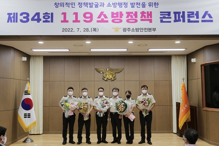 | ▲ 광주북부소방서, 제 34회119 소방정책 콘퍼런스 연구논문 발표 대회 1위 차지 기념촬영 / 광주광역시 제공 |