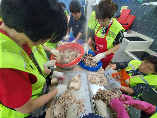 | ▲ '사랑의 삼계죽' 행사에서는 시흥5동 통장협의회 소속 통장 30여명이 직접 만든 삼계죽을 대접했다. |