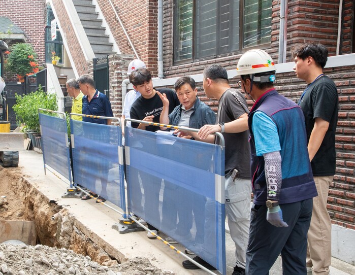 | ▲ 성암국제고등학교 주변 노후화된 하수관로 개량 공사 현장을 방문한 노윤상 의원이 관계자들과 현장을 둘러보고 있다. (사진=강북구의회 제공) |
