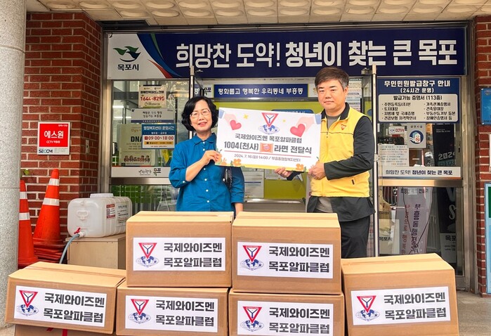 [목포=황승순 기자]국제와이즈멘 목포알파클럽(회장 김재욱)이 지난 16일 사랑의 1004 라면을 부홍동행정복지센터에 기탁했다.