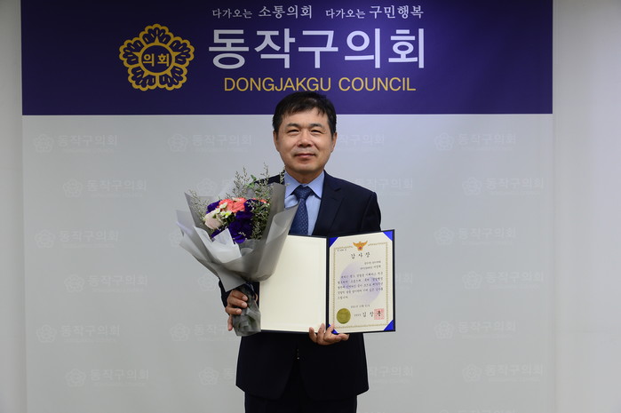 | ▲ 감사장을 받은 서정택 동작구의원이 기념촬영을 하고 있다. (사진제공=동작구의회) |