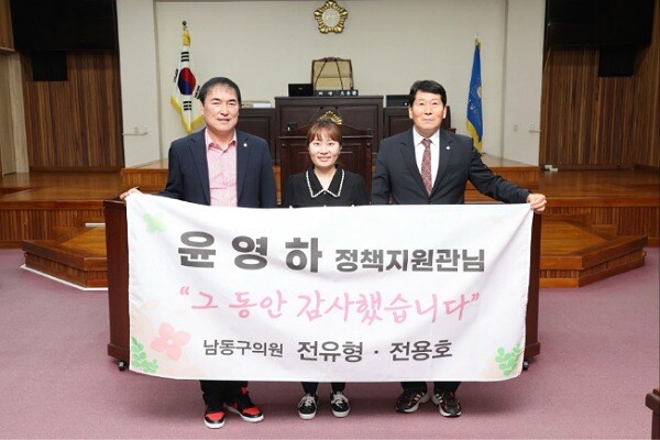 (인천=김형만 기자) 남동구의회 전유형‧전용호(국민의힘) 두 의원은 6월 26일자로 남동구의회에서 정책지원관으로 근무하며 퇴직하는 담당 윤영하 정책지원관에게 감사패를 수여했다.