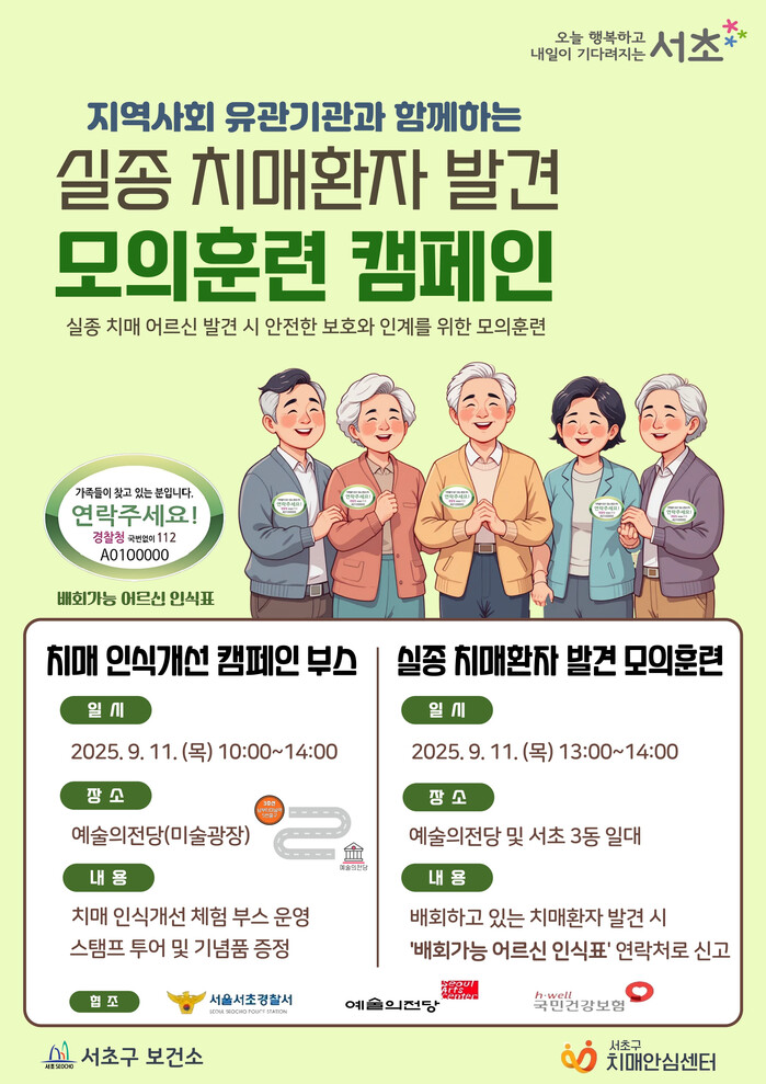 이번 모의훈련은 올해 2회째를 맞아 서초3동 치매안심경로당을 거점으로 지역 밀착형 대응 체계를 더욱 강화할 전망이다.