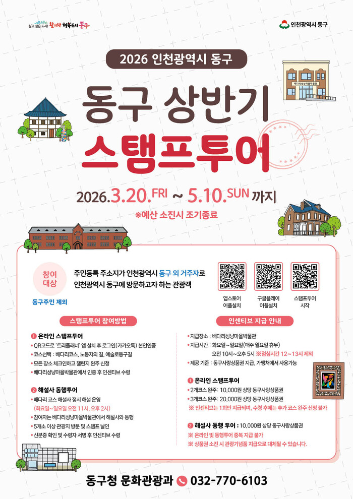 [인천=문찬식 기자] 인천 동구(구청장 김찬진)는 3월 20일~5월 10일까지‘2026년 동구 상반기 스탬프투어’를 운영한다고 밝혔다.