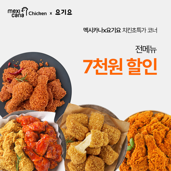이번 프로모션은 17일부터 19일, 25일부터 29일 총 2회에 걸쳐 진행되며, 요기요 어플리케이션으로 멕시카나 치킨을 이용하는 고객이라면 누구에게나 혜택이 제공된다. 프로모션 이용 방법은 멕시카나치킨의 모든 메뉴 주문 시 4천원 할인을 기본으로 적용받을 수 있으며, 메인 페이지 내 ‘치킨 초특가’ 배너 클릭 시 노출되는 브랜드 중 멕시카나치킨을 선택하여 쿠폰을 다운로드 한 후 제품 구매 및 결제 시 해당 쿠폰을 사용하면 3천원 추가 할인 혜택이 즉시 적용되어 총 7천원의 할인 혜택을 누릴 수 있다.