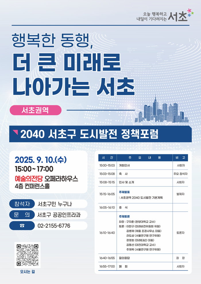이어지는 주제 토론은 구자훈 한양대학교 교수가 좌장을 맡고, 이한규 서초 미래위원회 위원, 김병채 서울 조경사무소 대표, 라도삼 서울연구원 선임연구위원, 장영호 미래E&D 대표, 김동선 대진대학교 교수, 주재욱 서울연구원 연구위원 등 각 분야 전문가가 참여해 교통, 녹지, 문화예술, 산업 등 현안 과제를 중심으로 심도 있는 논의를 펼친다. 토론 후에는 주민 질의응답을 통해 다양한 의견을 수렴한다.