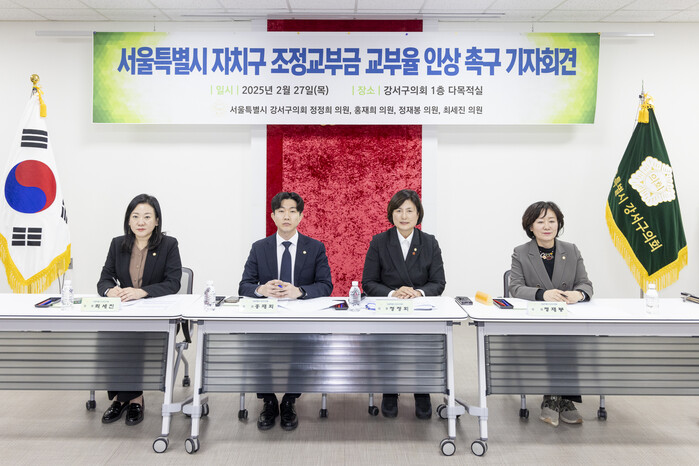 [시민일보 = 박소진 기자] 서울특별시 강서구의회 행정재무위원회 의원들이 최근 구의회 다목적실에서 기자회견을 열고 ‘서울특별시 자치구의 재원조정에 관한 조례’ 개정을 촉구했다고 밝혔다.