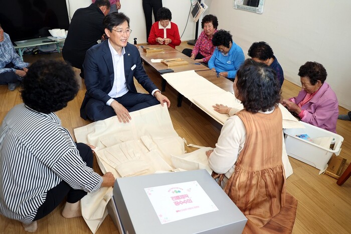 [영암=정찬남 기자] 우승희 전남 영암군수가 3일 민선8기 영암군의 ‘생산적 복지’ 현장인 경로당 공동작업장 중 하나인 미암면 선황2구경로당을 방문해 마을 어르신들과 이야기를 나눴다.