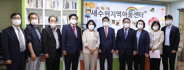 | ▲ 새수원지역아동센터를 찾은 제12대 수원시의회 전반기 의장단이 기념촬영을 하고 있다. (사진제공=수원시의회) |